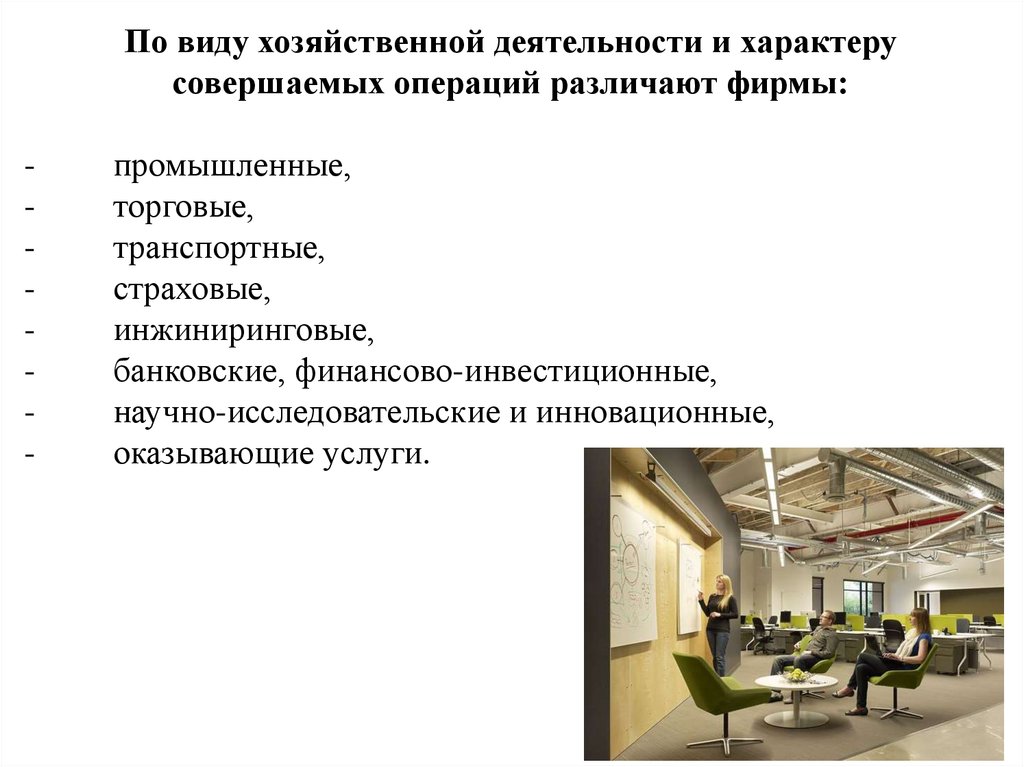 По виду хозяйственной деятельности и характерусовершаемых операций различают фирмы: