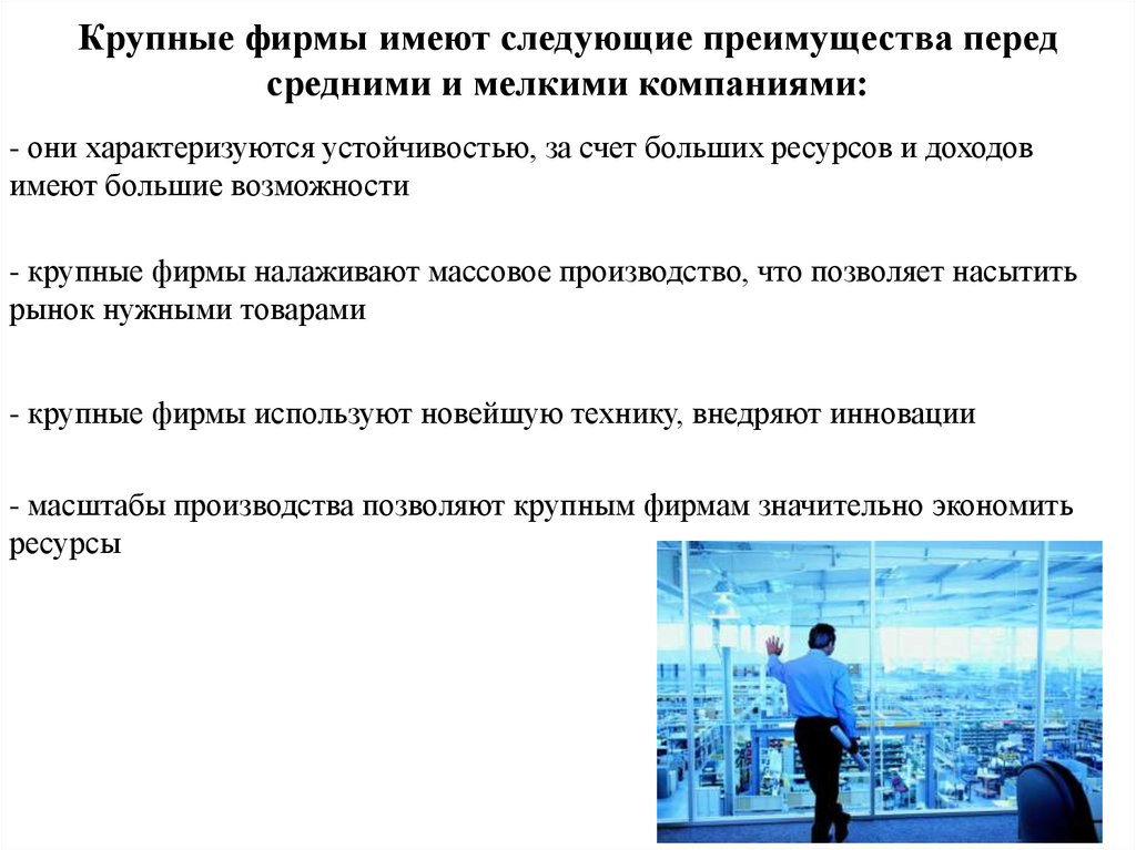 Крупные фирмы имеют следующие преимущества передсредними и мелкими компаниями: