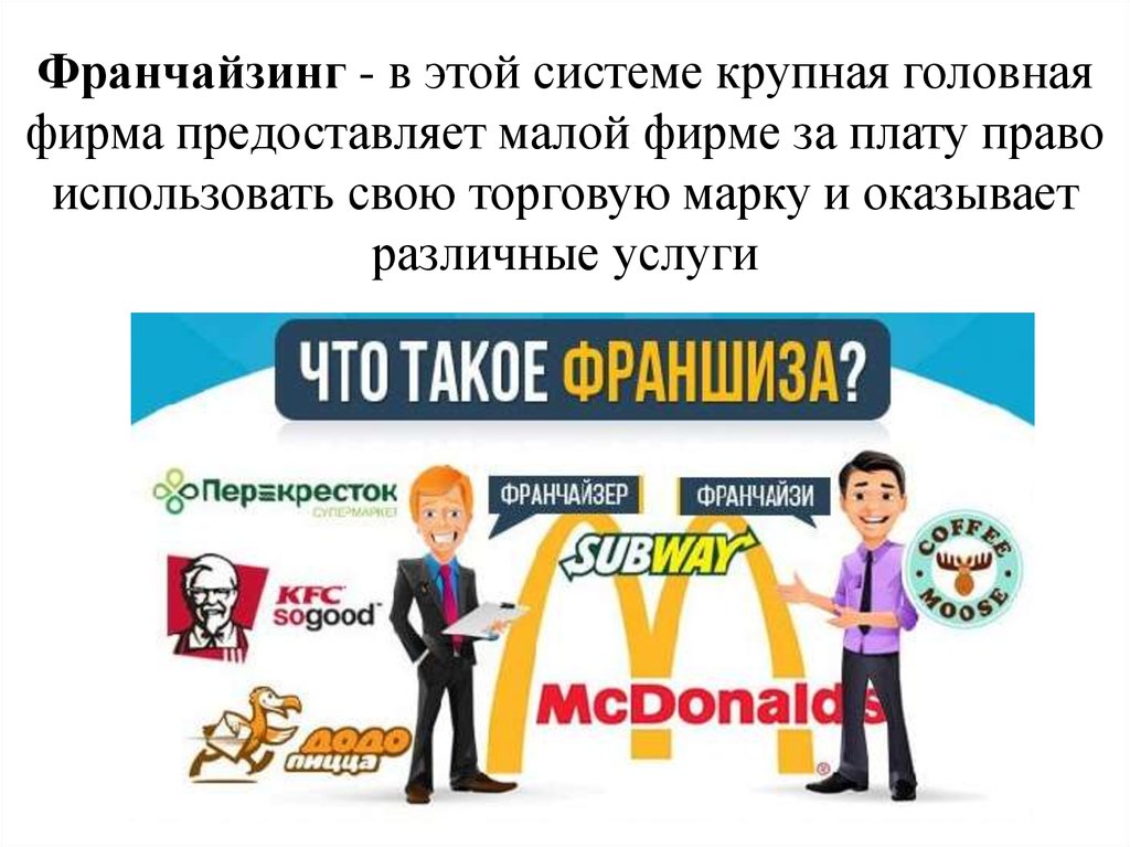 Франчайзинг - в этой системе крупная головнаяфирма предоставляет малой фирме за плату право