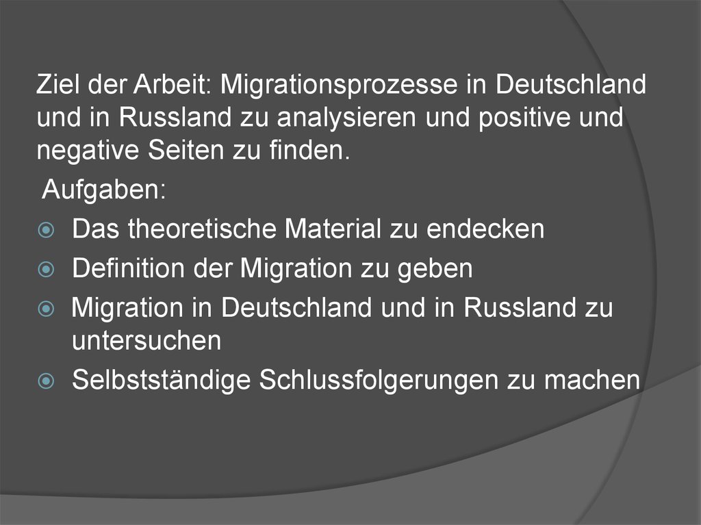 Ziel der Arbeit: Migrationsprozesse in Deutschlandund in Russland zu analysieren und positive und