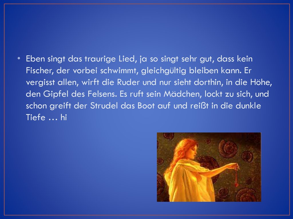 • Eben singt das traurige Lied, ja so singt sehr gut, dass keinFischer, der vorbei schwimmt, gleichgültig bleiben kann. Er