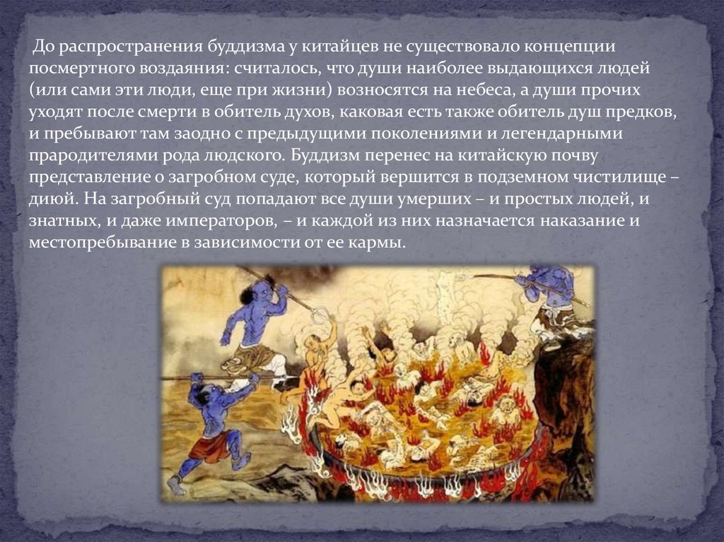 До распространения буддизма у китайцев не существовало концепциипосмертного воздаяния: считалось, что души наиболее выдающихся людей