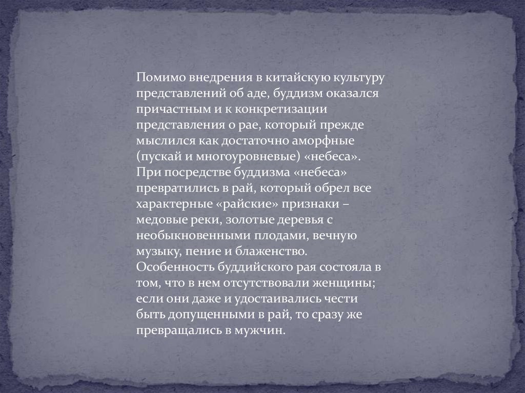 Помимо внедрения в китайскую культурупредставлений об аде, буддизм оказался