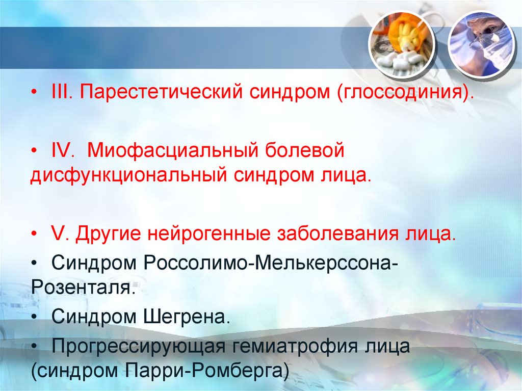 • III. Парестетический синдром (глоссодиния).• IV. Миофасциальный болевой