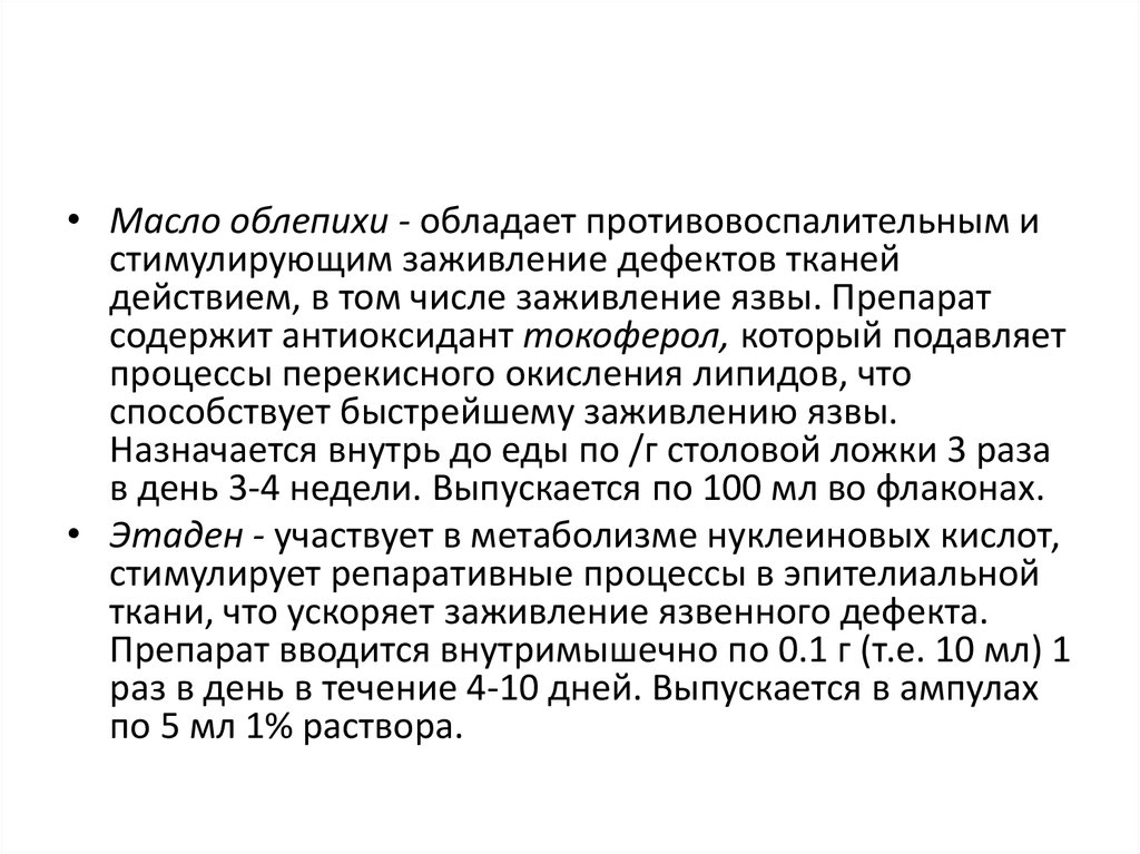 • Масло облепихи - обладает противовоспалительным истимулирующим заживление дефектов тканей