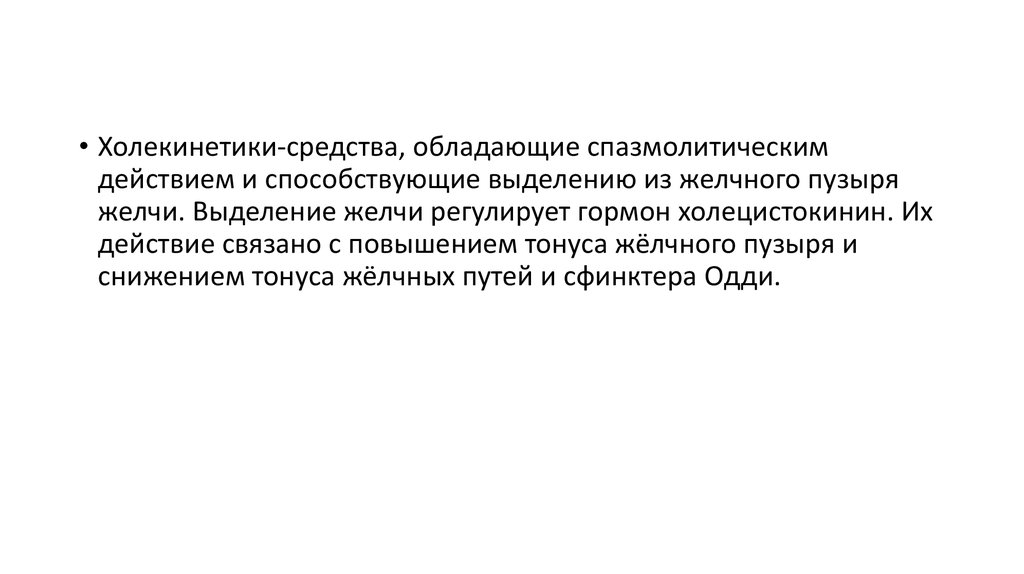• Холекинетики-средства, обладающие спазмолитическимдействием и способствующие выделению из желчного пузыря