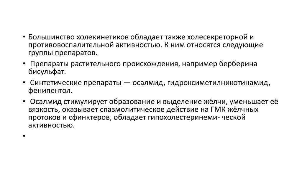 • Большинство холекинетиков обладает также холесекреторной ипротивовоспалительной активностью. К ним относятся следующие