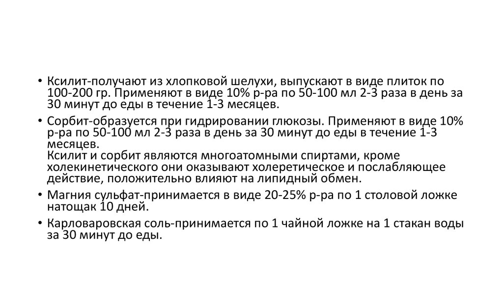 • Ксилит-получают из хлопковой шелухи, выпускают в виде плиток по100-200 гр. Применяют в виде 10% р-ра по 50-100 мл 2-3 раза в день за