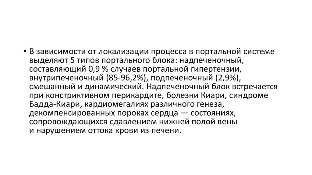 • В зависимости от локализации процесса в портальной системевыделяют 5 типов портального блока: надпеченочный,