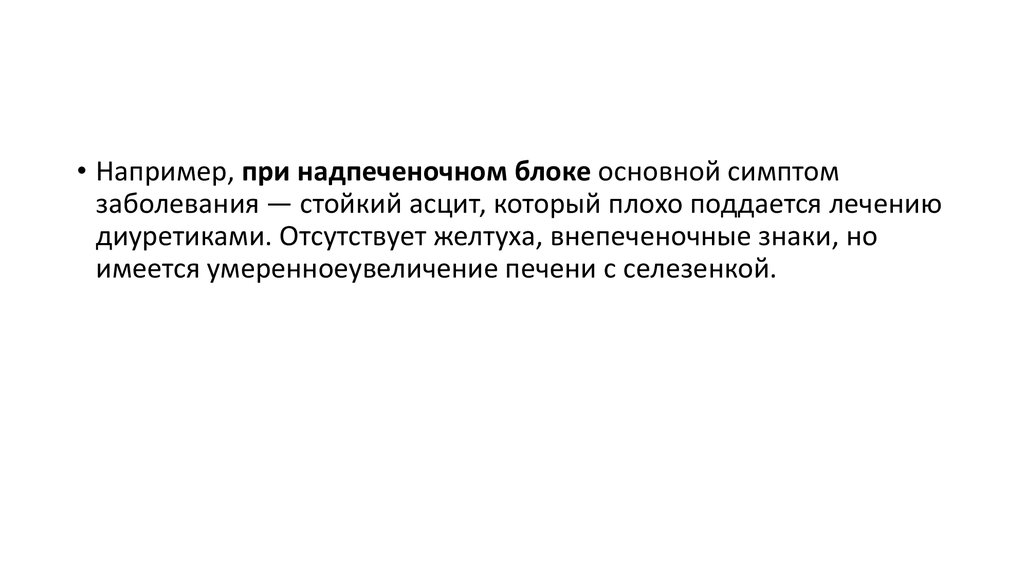 • Например, при надпеченочном блоке основной симптомзаболевания — стойкий асцит, который плохо поддается лечению