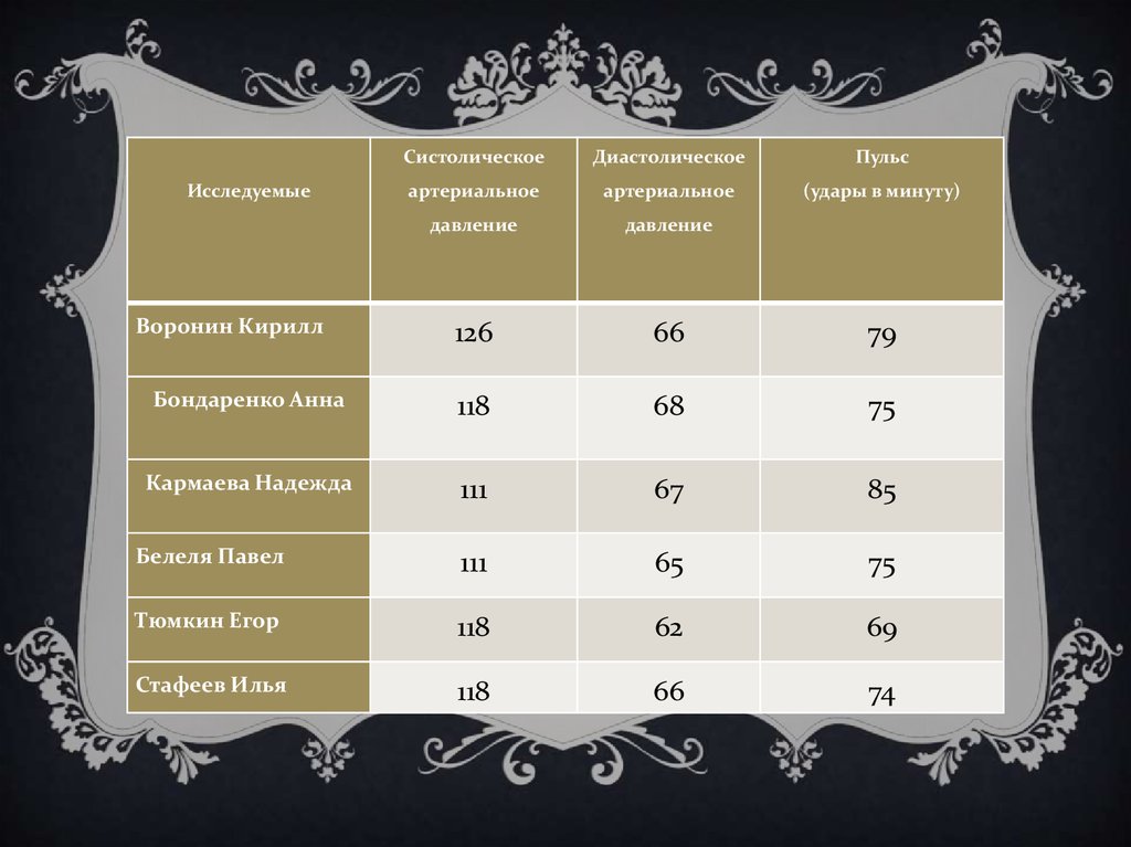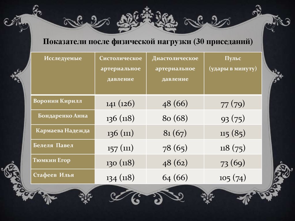 Показатели после физической нагрузки (30 приседаний)Исследуемые