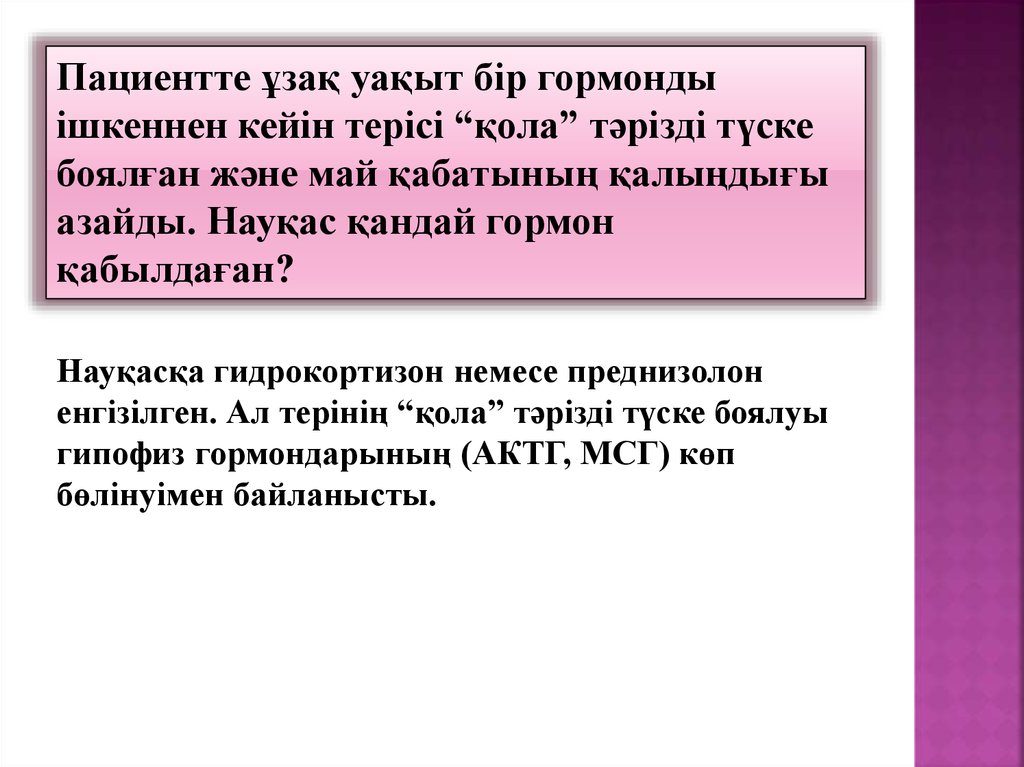 Пациентте ұзақ уақыт бір гормондыішкеннен кейін терісі “қола” тәрізді түске