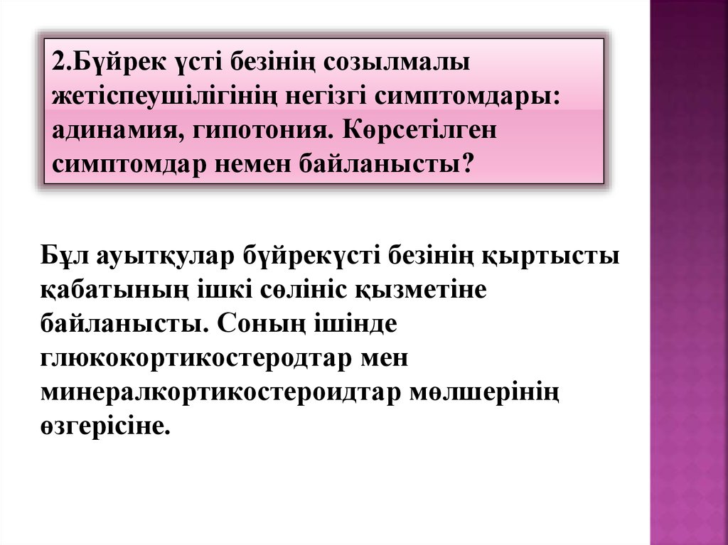2.Бүйрек үсті безінің созылмалыжетіспеушілігінің негізгі симптомдары: