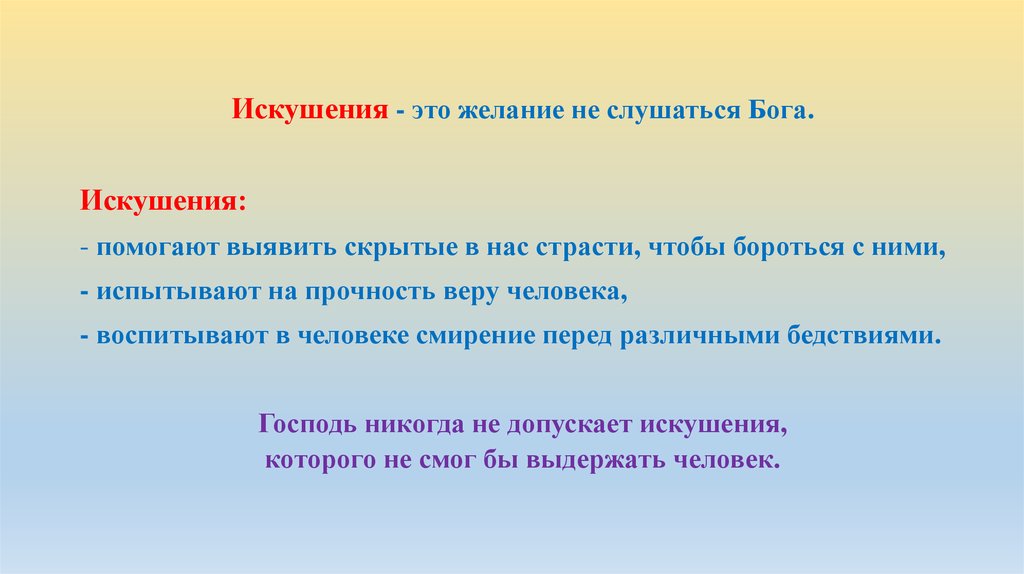 Искушения - это желание не слушаться Бога.Искушения: