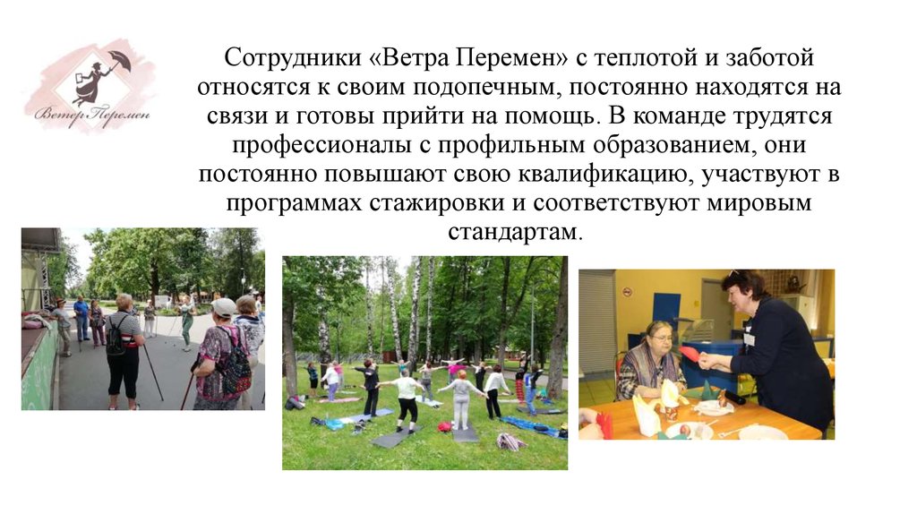2. помогает людям старшего возраста обеспечить комфортную и счастливую жизнь, благодаря ежедневной заботе и помощи в делах. «Ветер