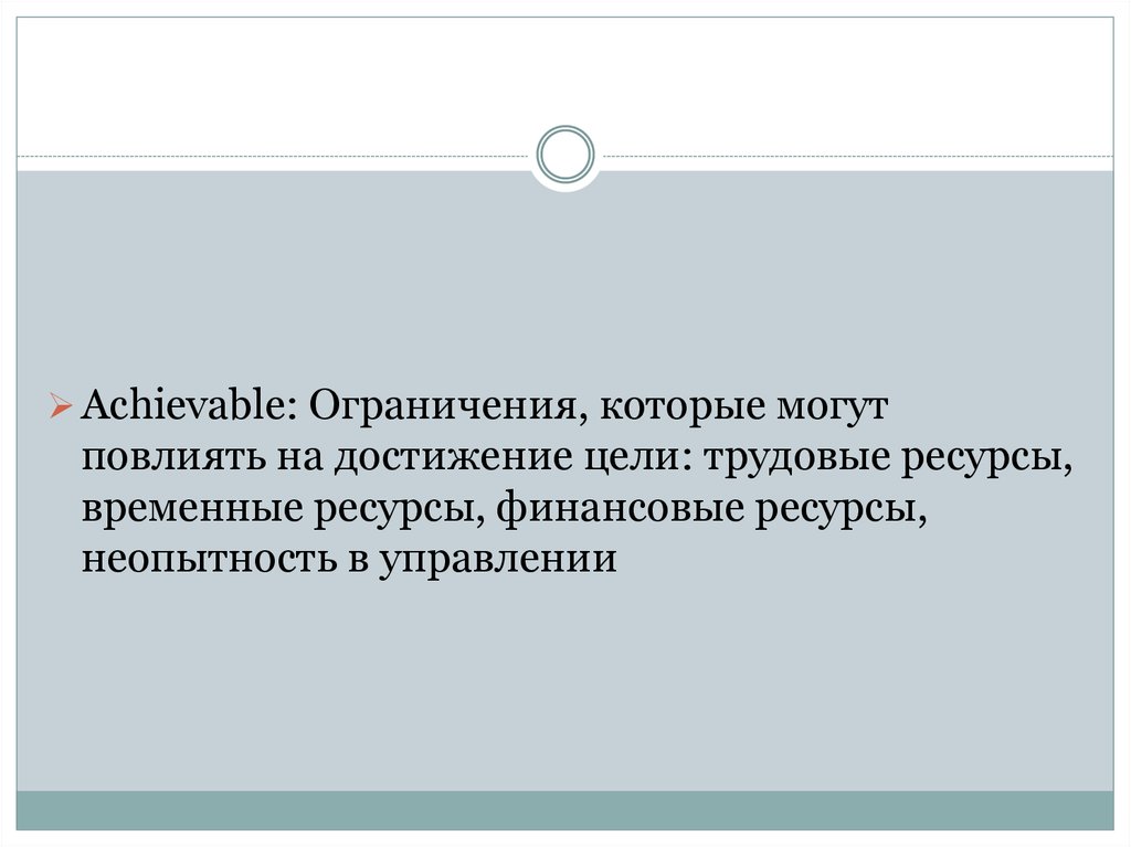 Achievable: Ограничения, которые могутповлиять на достижение цели: трудовые ресурсы,