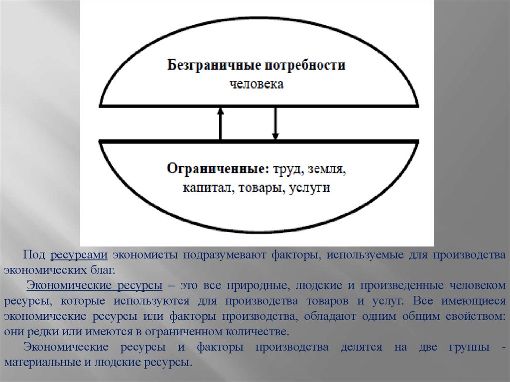 Экономические ресурсы и факторы производства делятся на две группы материальные и людские ресурсы.