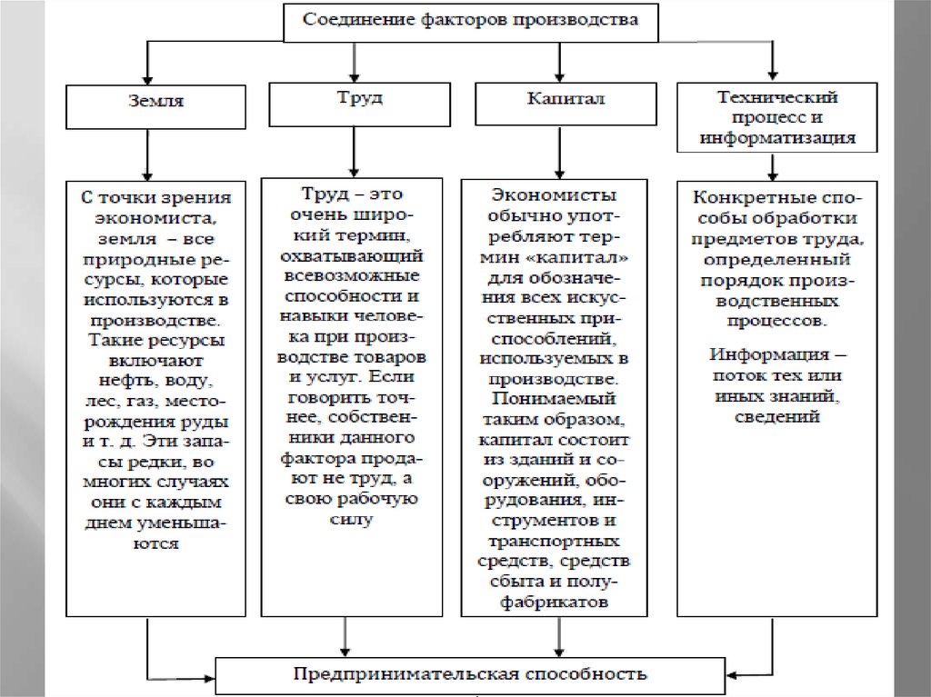рабочую силу, предпринимательскую способность, инструменты, машины,