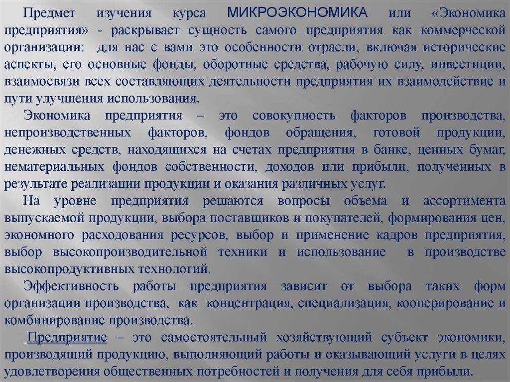 Предмет изучения курса МИКРОЭКОНОМИКА или «Экономикапредприятия» - раскрывает сущность самого предприятия как коммерческой