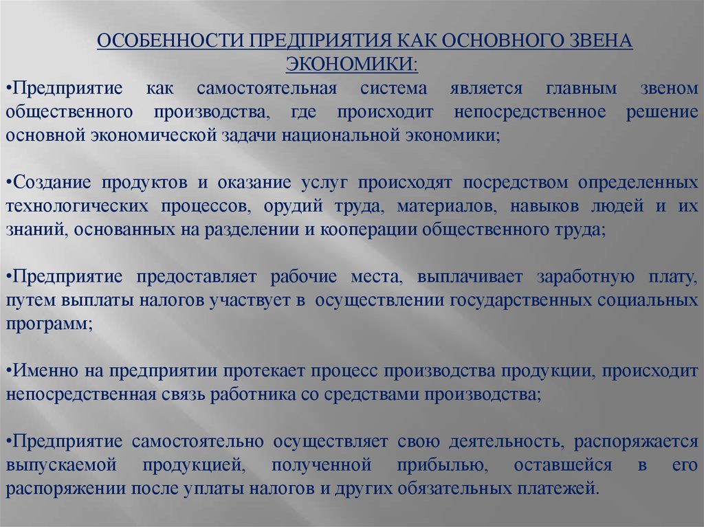 ОСОБЕННОСТИ ПРЕДПРИЯТИЯ КАК ОСНОВНОГО ЗВЕНАЭКОНОМИКИ: