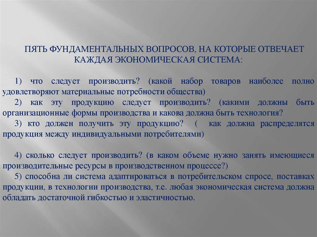 ПЯТЬ ФУНДАМЕНТАЛЬНЫХ ВОПРОСОВ, НА КОТОРЫЕ ОТВЕЧАЕТКАЖДАЯ ЭКОНОМИЧЕСКАЯ СИСТЕМА: