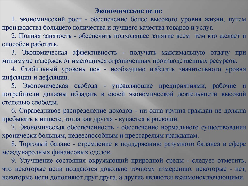 Экономические цели:1. экономический рост - обеспечение более высокого уровня жизни, путем