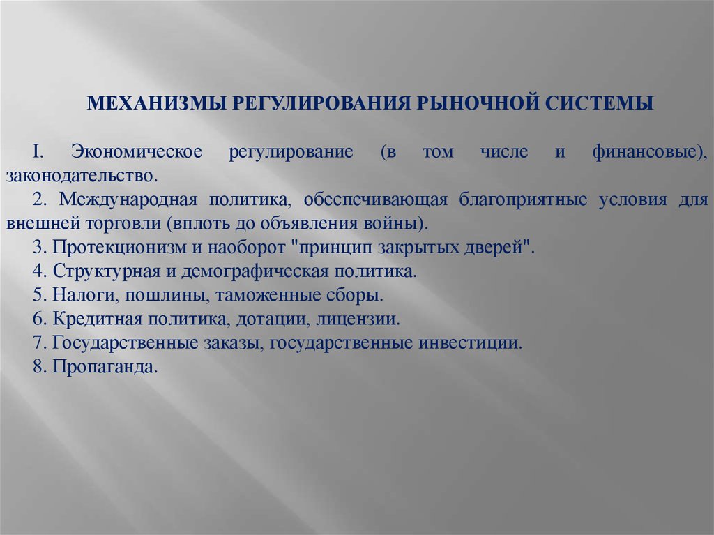 МЕХАНИЗМЫ РЕГУЛИРОВАНИЯ РЫНОЧНОЙ СИСТЕМЫI. Экономическое регулирование (в том числе и финансовые),