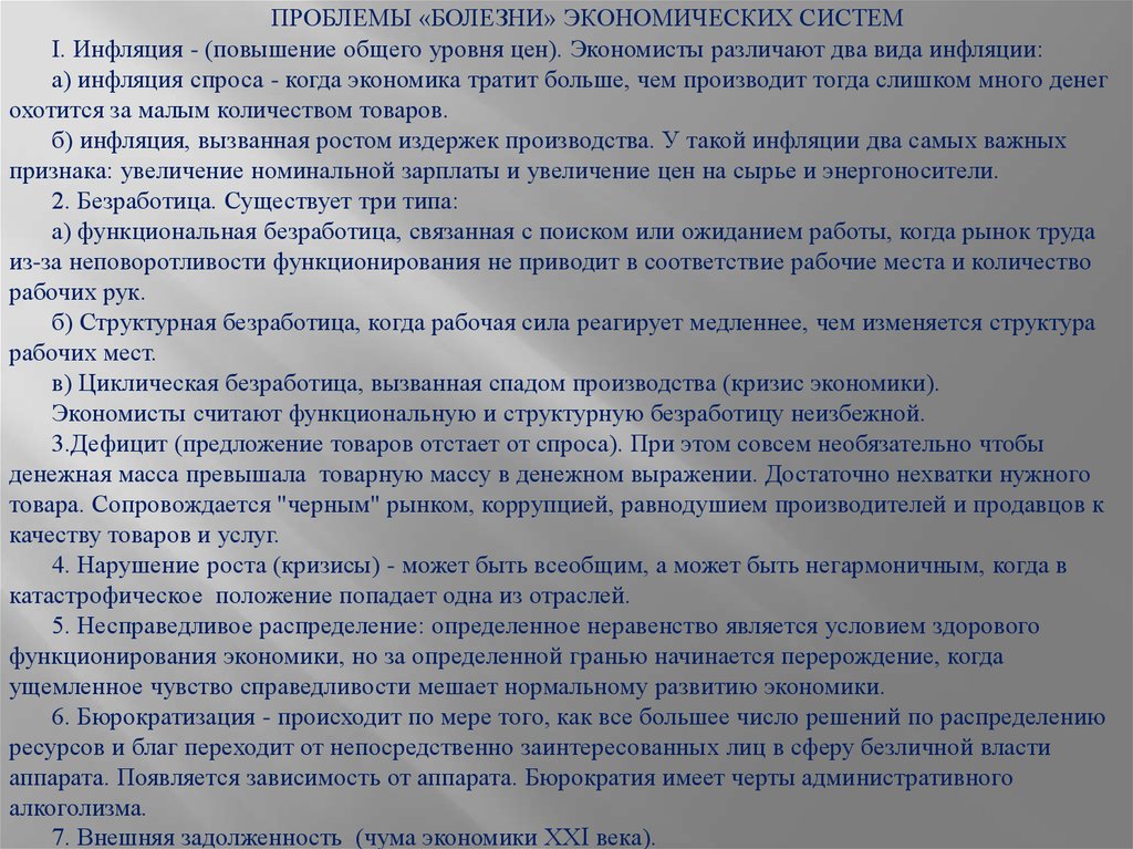 ПРОБЛЕМЫ «БОЛЕЗНИ» ЭКОНОМИЧЕСКИХ СИСТЕМI. Инфляция - (повышение общего уровня цен). Экономисты различают два вида инфляции: