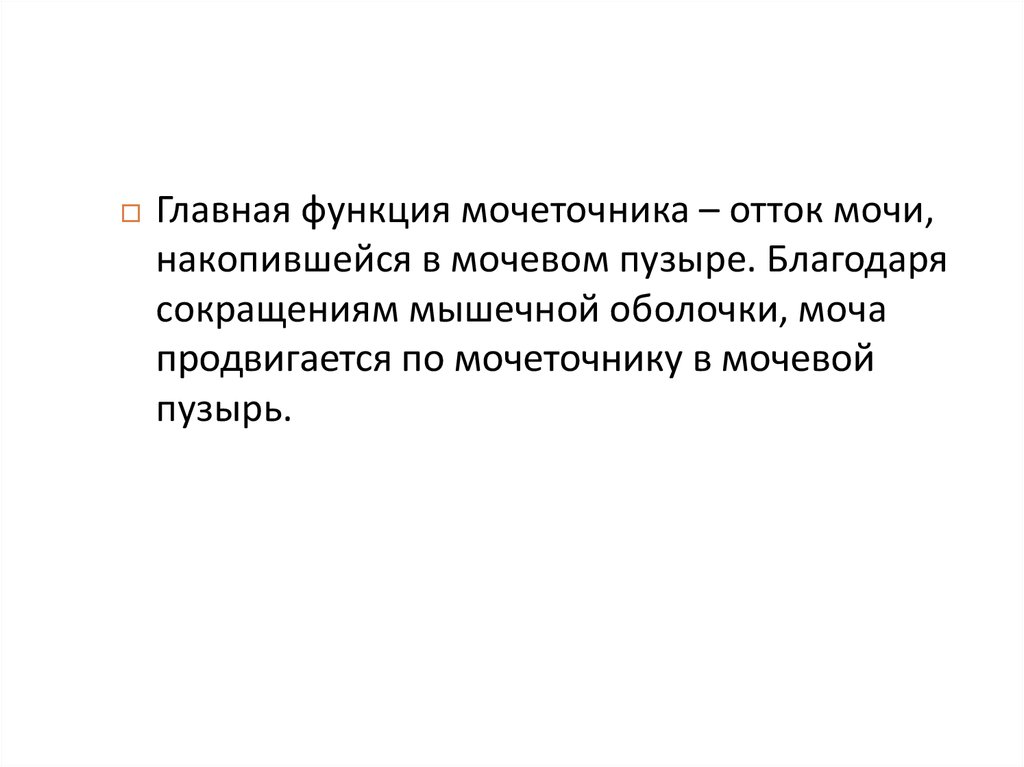 Главная функция мочеточника – отток мочи,накопившейся в мочевом пузыре. Благодаря