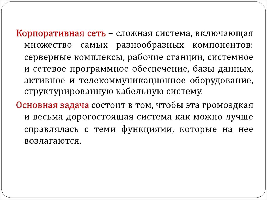 Корпоративная сеть – сложная система, включающаямножество самых разнообразных компонентов:
