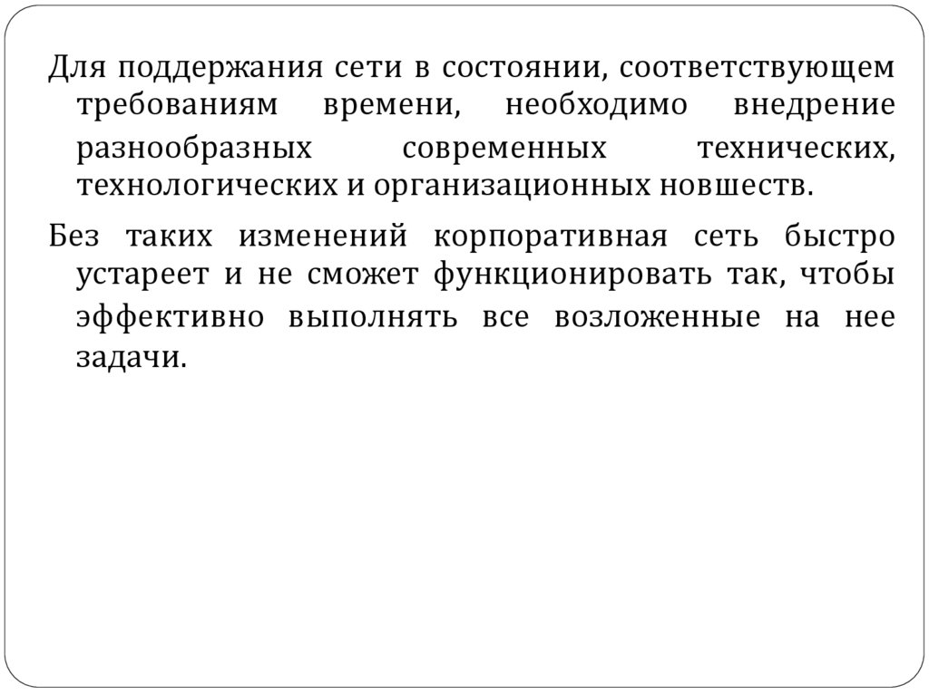 Для поддержания сети в состоянии, соответствующемтребованиям времени, необходимо внедрение