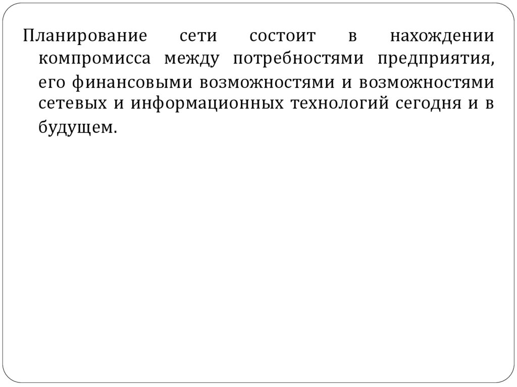 При планировании сети необходимо принять решения почетырем группам вопросов: