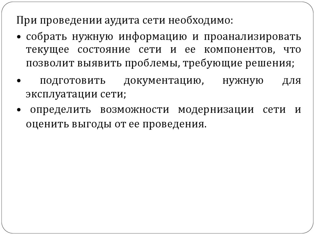 При проведении аудита сети необходимо:• собрать нужную информацию и проанализировать