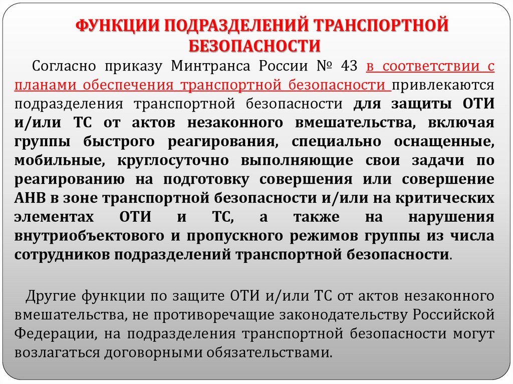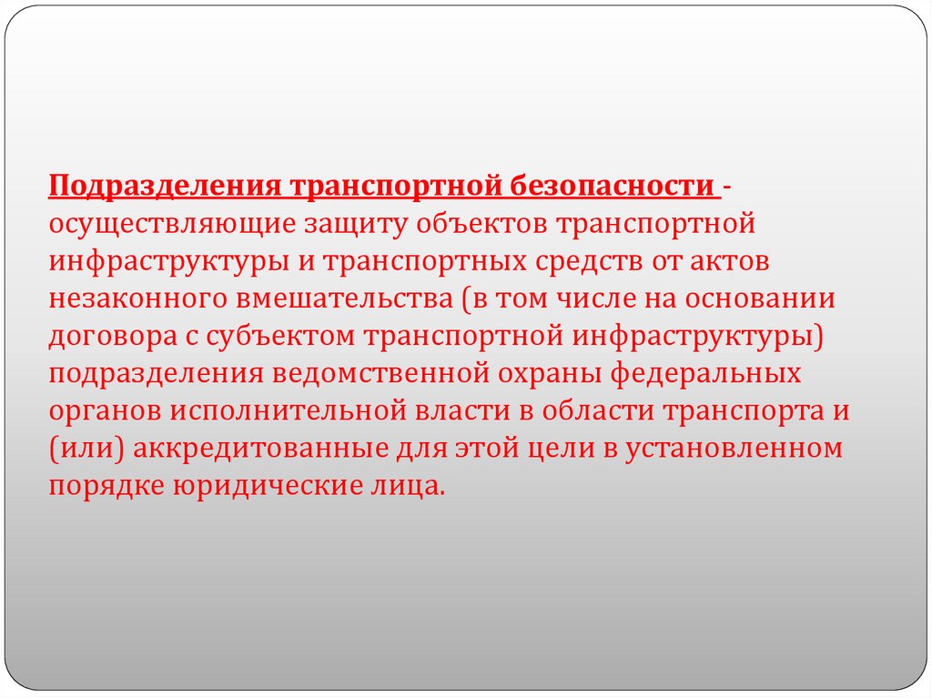 Подразделения транспортной безопасности осуществляющие защиту объектов транспортнойинфраструктуры и транспортных средств от актов