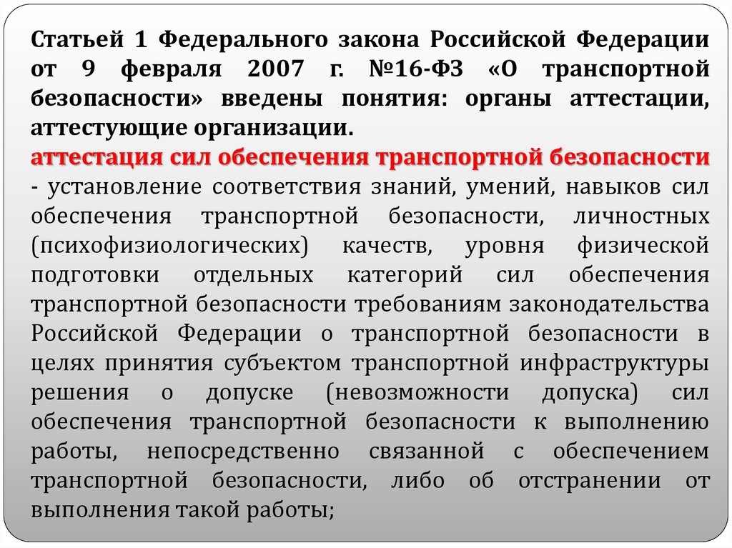 Статьей 1 Федерального закона Российской Федерации от 9 февраля 2007 г.№16-ФЗ «О транспортной безопасности» введены понятия: