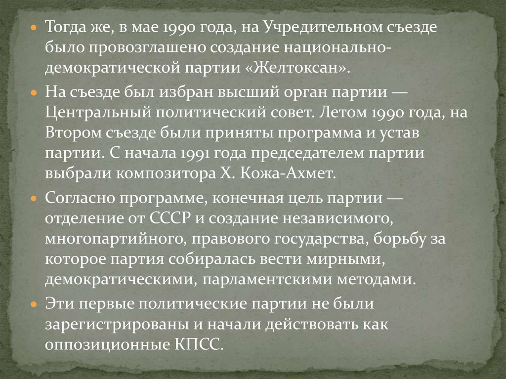 Тогда же, в мае 1990 года, на Учредительном съездебыло провозглашено создание национальнодемократической партии «Желтоксан».