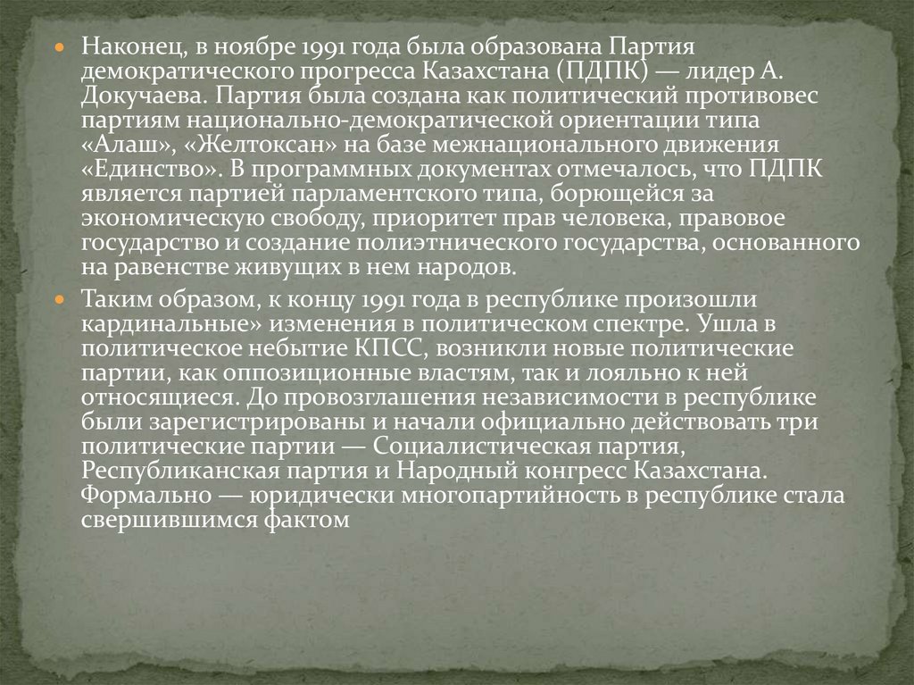 Наконец, в ноябре 1991 года была образована Партиядемократического прогресса Казахстана (ПДПК) — лидер А.