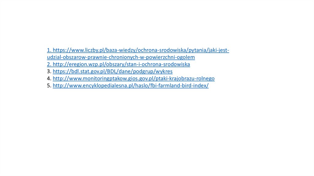 1. https://www.liczby.pl/baza-wiedzy/ochrona-srodowiska/pytania/jaki-jestudzial-obszarow-prawnie-chronionych-w-powierzchni-ogolem2. http://eregion.wzp.pl/obszary/stan-i-ochrona-srodowiska