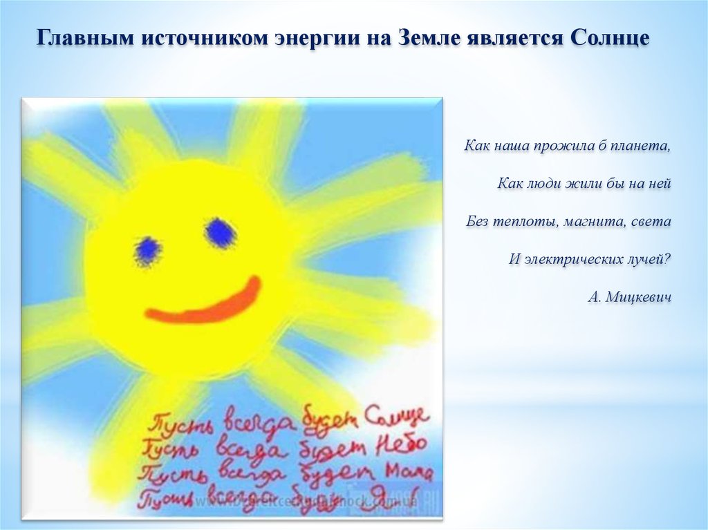 Главным источником энергии на Земле является СолнцеКак наша прожила б планета,