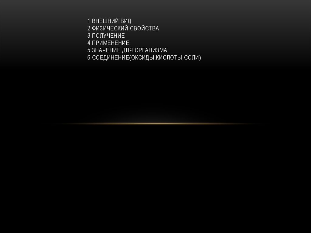 1. 1 внешний вид 2 физический свойства 3 получение 4 применение 5 значение для организма 6 соединение(оксиды,кислоты,соли)
