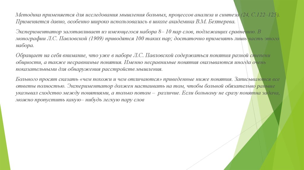 Методика применяется для исследования мышления больных, процессов анализа и синтеза (24, С.122–125).Применяется давно, особенно широко использовалась в школе академика В.М. Бехтерева.