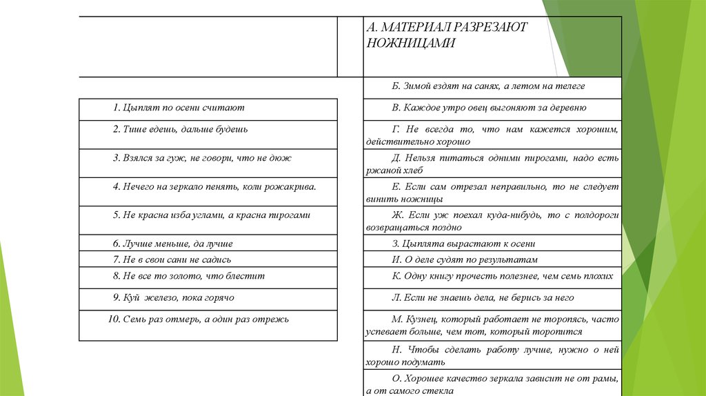 пачку таблиц с фразами и предлагает: «Положите рядом с каждой пословицей