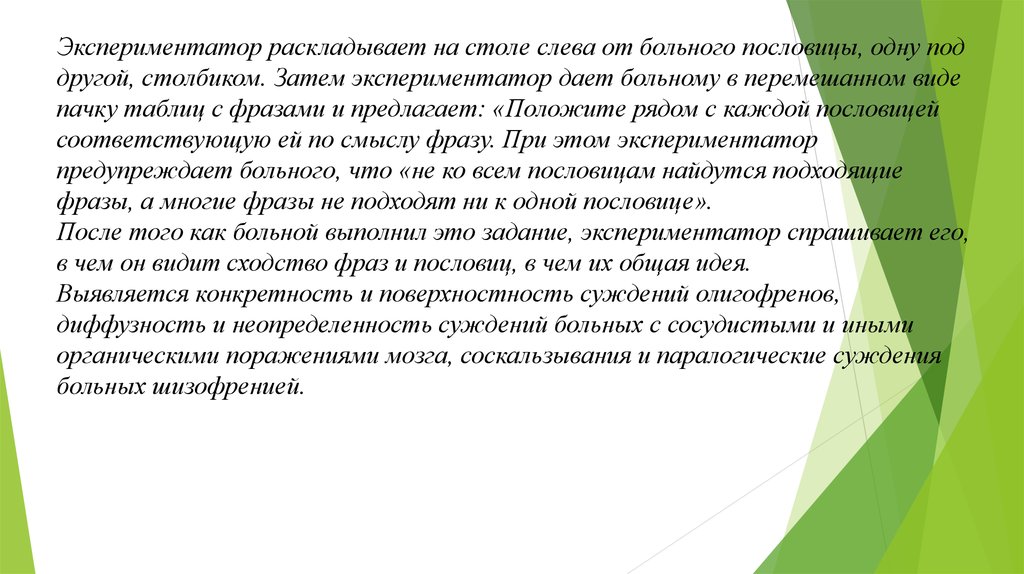 ответы полностью. Экспериментатор должен настаивать на том, чтобы больной обязательно раньше