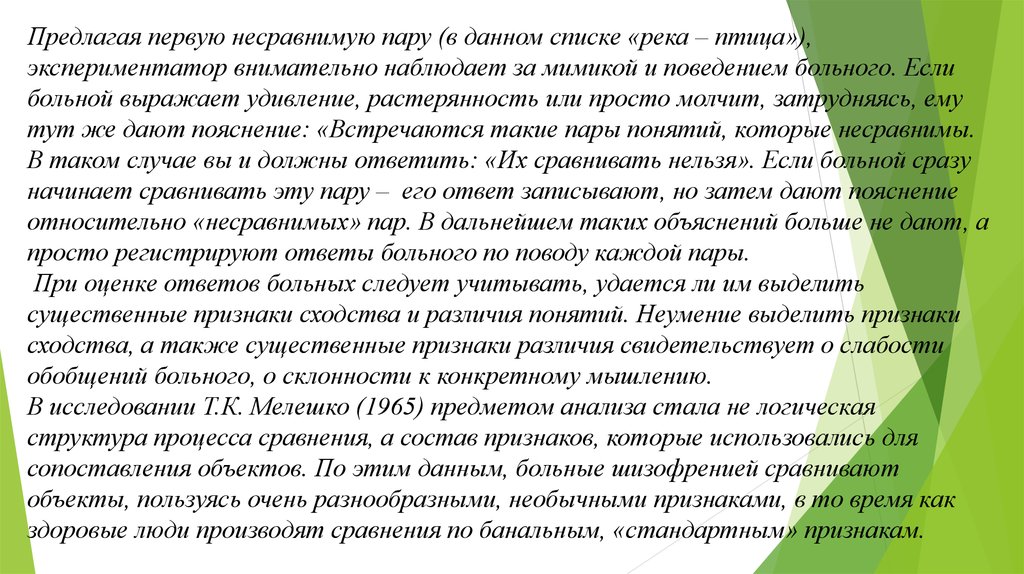 Предлагая первую несравнимую пару (в данном списке «река – птица»),экспериментатор внимательно наблюдает за мимикой и поведением больного. Если