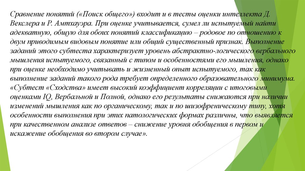 Сравнение понятий («Поиск общего») входит и в тесты оценки интеллекта Д.Векслера и Р. Амтхауэра. При оценке учитывается, сумел ли испытуемый найти