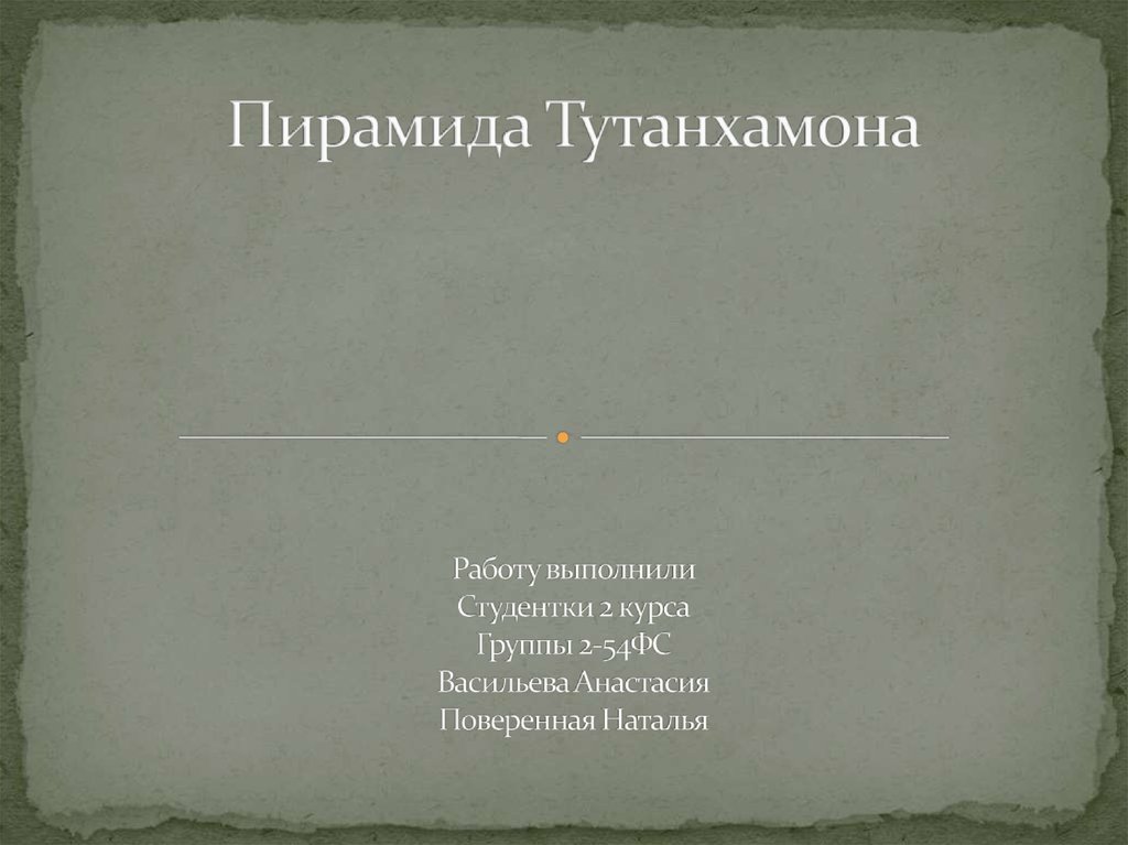 1. Пирамида Тутанхамона Работу выполнили Студентки 2 курса Группы 2-54ФС Васильева Анастасия Поверенная Наталья