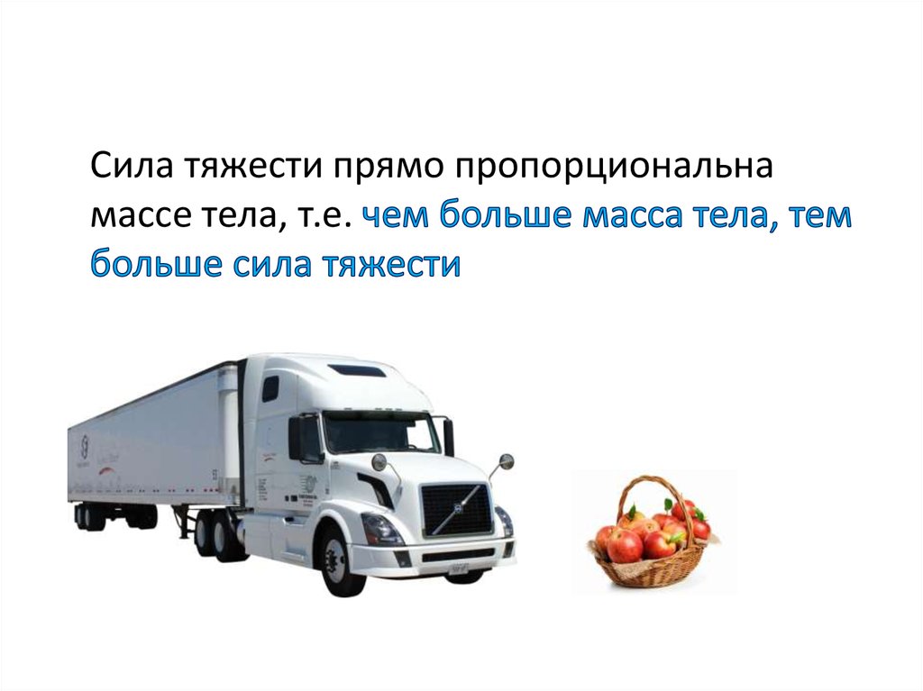 Сила тяжести прямо пропорциональнамассе тела, т.е.