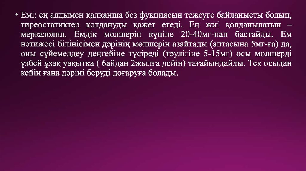 Алдын алу: Ең алдымен йод кемістігін жоюға байланысты эндемиялық аймақта тұзды йодтау ұсынылады. Арнайы емс ретінде алдын алу