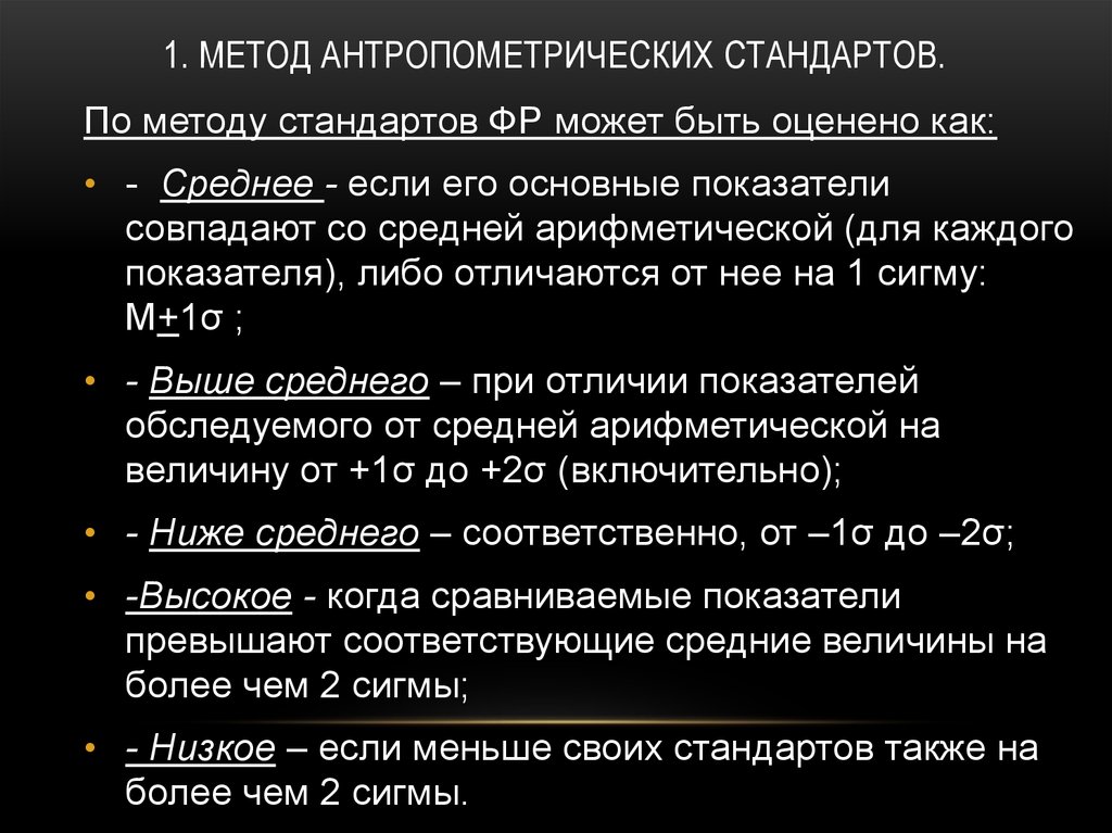 1. МЕТОД АНТРОПОМЕТРИЧЕСКИХ СТАНДАРТОВ.По методу стандартов ФР может быть оценено как: