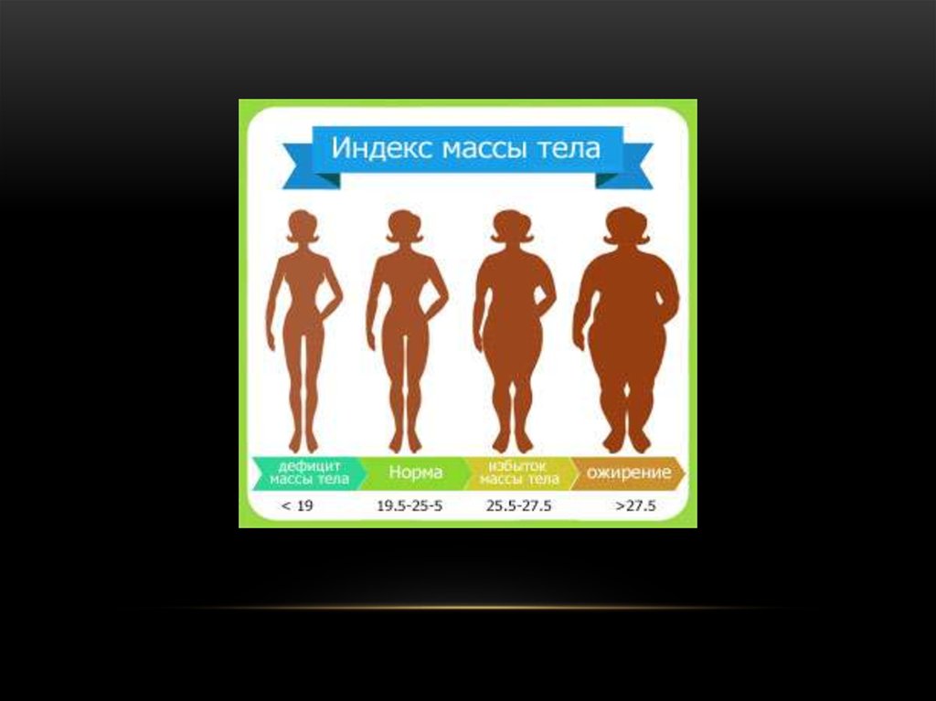 • Индекс массы тела (ИМТ) - соотношениевеса тела (в кг), к квадрату роста (в